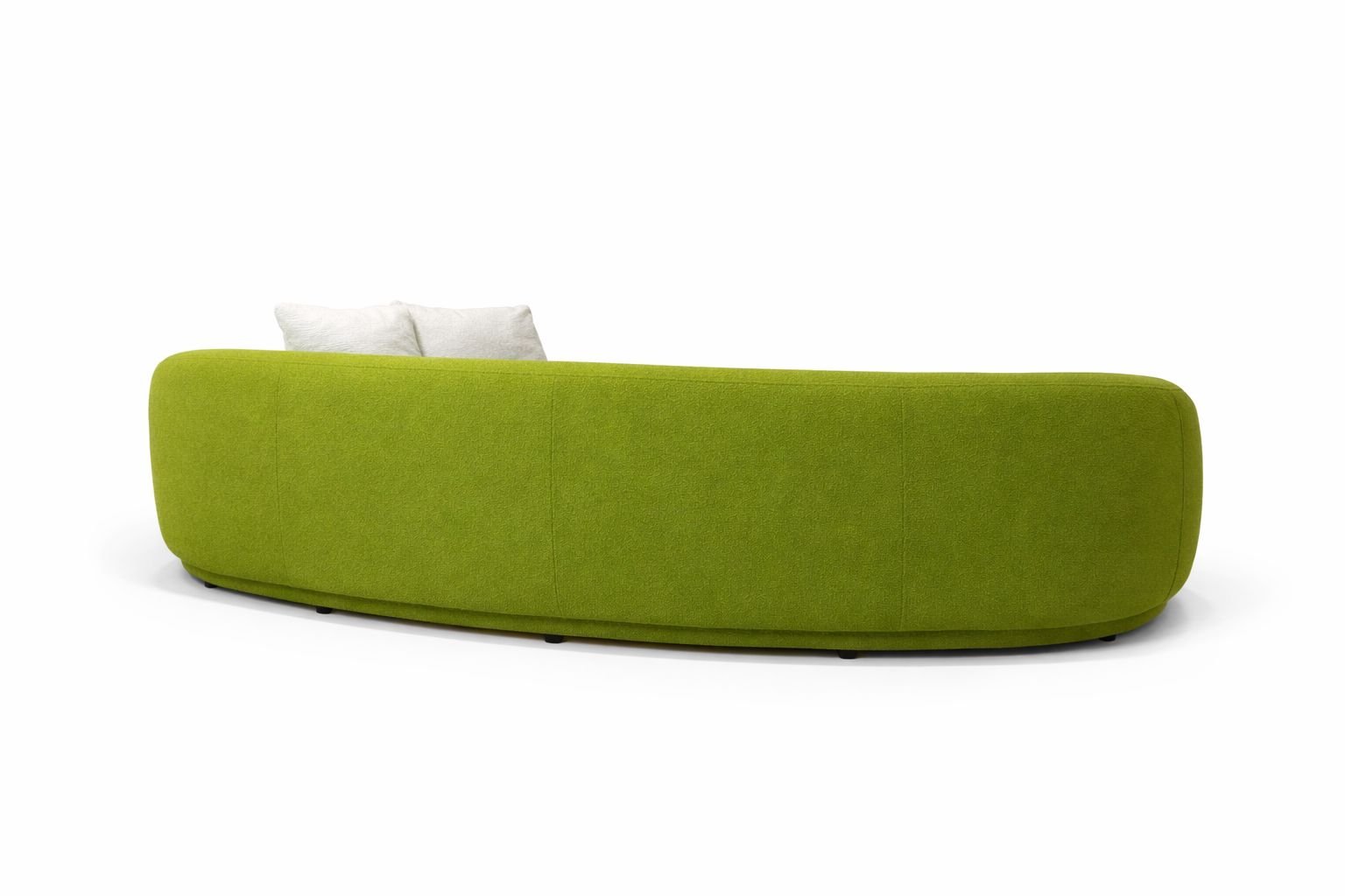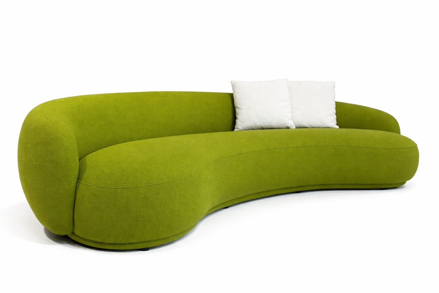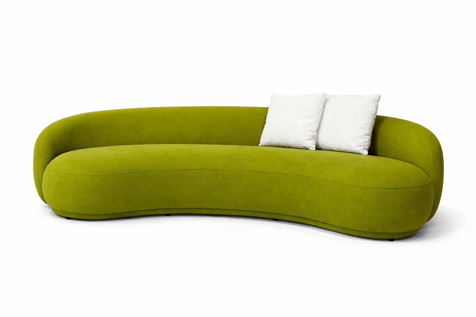 Curved Two-Seater Green Sofa featuring a solid wood and plywood frame, designed with a smooth curved silhouette for a modern and inviting seating experience.